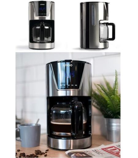 Livoo Cafetière Programmable Machine À Café Inox Grise 900w 12-Tasses-Minuteur Lcd De 24-Heures-Acier Inoxydable Haute Qualité