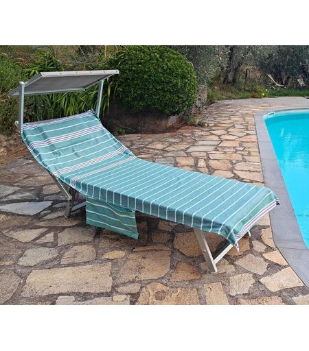 RFVVV-® Serviette de Plage Riviera 75x195cm en Coton, à Rayures/Serviette de Plage Chaise Longue avec Coussin, Poches et Sac de Transport/Vert et Rouge