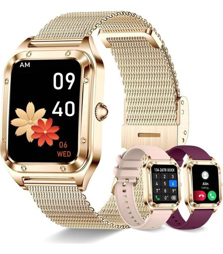 Appels Bluetooth/Notification Push/Assistant Vocal Avec un haut-parleur et un microphone intégrés, la montre intelligente Colesma pour femme peut passer et recevoir des appels et recevoir des mes s d'application directement, y compris SMS, Instagram, Facebook, LinkedIn, Twitter, WhatsApp, Skype. ,Gmail,etc. Vous pouvez également libérer vos mains avec l'assistant vocal. Montre intelligente élégante et cadran de montre DIY Cette montre intelligente élégante pour femme dispose d'un écran tactile de 1,59 pouces avec une lunette en métal, est livrée avec 3 bracelets de montre interchangeables un bracelet métallique en acier inoxydable à mailles ultra fines et 2 bracelets de montre en silicone, vous pouvez changer le style et la couleur pour l'oc n. Plus de 180 cadrans de montre gratuits sont disponibles au choix, et vous pouvez également créer votre propre cadran de montre personnalisé avec vos propres photos. 120+ modes de rem en forme et surveillance de la santé cette montre intelligente dispose de plusieurs modes de rem en forme tels que la course en plein air, le vélo, le yoga et la randonnée pour vous aider à atteindre vos objectifs de rem en forme. Le capteur de haute précision intégré peut surveiller votre fréquence cardiaque/sang en temps réel. Oxygène/tension artérielle, suit et enregistre automatiquement votre sommeil, vous aide à comprendre comment vous dormez. Montre intelligente multifonction pour femme cette montre intelligente pour femme dispose de fonctions multiples telles que moniteur de cycle physiologique, podomètre, distance, ies, minuterie, chronomètre, recherche de téléphone, contrôle de la musique/appareil photo, affichage de la météo, réveil, etc. Vous pouvez également util r cette montre de fitness pour régler des al afin de vous rappeler de boire de l'eau et d'éviter les périodes prolongées de position ass . Étanchéité IP67 et capacité de la batterie de 210 cette montre intelligente en métal pour femme peut résister au lavage des mains, à la sueur ou aux éclaboussures d'eau, mais ne convient pas pour le bain, la natation, la plongée. La capacité de la batterie de 210 mAh prendra 2 heures pour se charger complètement, peut être utilisée pendant 5 heures. 7 jours.La montre intelligente pour femme est compatible avec Android 4.4 et iOS 7.1 ou supérieur.Le meilleur cadeau pour une petite amie, un amoureux ou un membre de la famille. ...