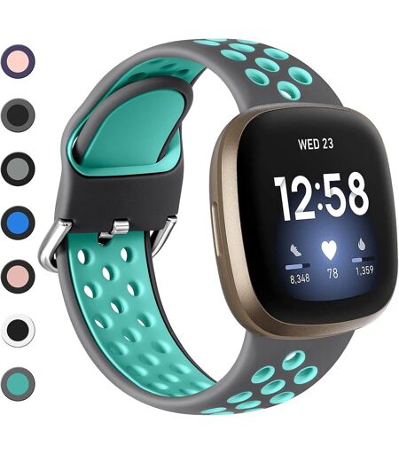 Bracelet Compatible Avec Fitbit Versa 4 Bracelet/Fitbit Versa 3 Bracelet/Fitbit Sense Bracelet/Fitbit Sense 2 Bracelet Femme Homme, Sport Respirant Silicone Remplacement, Gris/Sarcelle L