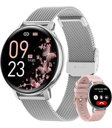Intelligence de la Mode Au Poignet La montre connectée femme dispose d'un écran tactile de 1,39 pouces, avec une résolution de 360*360, qui offre une expérience tactile fluide et prend soin de la santé visuelle des femmes. Avec un corps léger de seulement 29g, il peut être porté pendant de longues périodes sans pression. De plus, il est livré avec deux options de bracelet un en acier argenté et un autre en silicone rose, afin que vous puissiez facilement combiner avec différents styles. Prendre Soin de la Santé des Femmes Cette smartwatch suit avec précision trois périodes importantes la période menstruelle, la période d'ovulation et la période de sécurité. De plus, il vous permet de définir des rappels de règles sur l'application mobile « Pubu Wear », aidant ainsi les femmes à se préparer à des journées spéciales. La montre connectée femme offre de meilleurs soins aux femmes. Enregistrez vos ies et vos pas en temps réel pour vous aider à mieux contrôler la forme de votre corps. Surveillance de la Santé Équipé de capteurs avancés, il peut surveiller les niveaux d'oxygène dans le sang, la tension artérielle et la fréquence cardiaque en temps réel tout au long de la journée. La montre connectée offre une fonction de surveillance du sommeil pendant la nuit, vous aidant à améliorer vos habitudes de sommeil. Il dispose d'une fonction d'entraînement respiratoire qui peut vous aider à soulager facilement le stress et à ajuster votre style de vie à temps. Restez Toujours Connecté La montre connectée femme avec appel est équipée de Bluetooth 5.3 et peut stocker 500 contacts, ce qui facilite votre communication. Le haut-parleur et le microphone intégrés garantissent des appels plus clairs. La fonction de notification de mes s vous permet de ne manquer aucune information importante et l'assistant vocal AI rend votre vie plus intelligente. Compatible avec les appareils avec Android 5.1 ou supérieur/iOS 8.0 ou supérieur. 120+ Modes Sportifs Offre plus de 120 modes sportifs différents, vous offrant un large choix d'entraînements. Vous pouvez afficher l'itinéraire GPS et les données d'exercice via l'application mobile. NAIXUES montre connectée femme présente une conception étanche IP68 et une batterie de 300 mAh pour garantir des performances durables. Avec 5 cadrans de montre intégrés, 200 cadrans de montre en ligne et des cadrans de montre personnalisables, vous pouvez le modifier en fonction de votre style. ...
