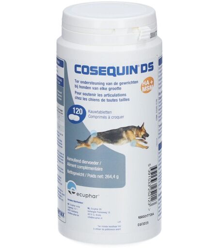 Cosequin® DS est un aliment complémentaire à base de glucosamine et de chondrotine.Ces deux molekules sont des constituants essentiels pour le soutien du cartilage. Cosequin® DS est recommandée pour les chiens vieillissants et les chiots de grande taille.Composition: Pour 1 compriméGlucosamine HCI500 mgSulfate de chondroitine400 mgStéarate de magnésium5 mgConstituants analytiques:Protéine brute 20,8 %, Fibres alimentaires brutes 21,8 %, Matières grasses brutes 1,2 %, Cendres brutes 7,2 %.Additifs:Manganèse 3200 mgDosage:Pour utilisation par voie oral.Cosequin® DS est appétant pour les chiens et peut être donné à votre animal comme récompense ou bien ajouté directement à sa nourriture.Poids du chienProgramme initialComprimés/JourProgramme d'entretienComprimés/JourPetit (<10 kg)11/2Moyen (10-25 kg)21Grand (>25-50 kg)31-2Très grand (> 50 kg)42Programme initial:Donner tous les jours pendant 4-6 semaines ou selon la recommandation de votre vétérinaire.Programme d'entretien:Après la phase initiale, réduire progressivement la ration par étapes de 1/2 à 1 comprimé pour passer à la ration d'entretien. Cette ration d'entretien peut alors être utilisée à long terme.Conservation:Conserver au sec, à l'abri de la lumière et à température ambiante (15-25°C).ConditionnementPot de 120 comprimés à croquer ...