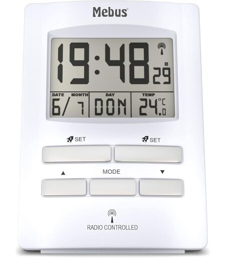 Commande radio (D 77) le réveil se règle automatiquement à l'heure correcte, y compris le réglage de l'heure d'été ou d'hiver. Deux heures de réveil réglables très pratique réglez deux heures de réveil différentes. Les heures peuvent être activées, désactivées et modifiées avec deux boutons séparés. Avec thermomètre intérieur voir en un coup d'?il la température ambiante actuelle en °C ou °F. Assurez ainsi la bonne température de vie ou de sommeil et plus de bien-être. Rétroéclairage appuyez sur le bouton situé sur le dessus du réveil pour activer l'éclairage de l'écran. Ainsi, l'heure peut être lue dans l'obscurité. La couleur de l'éclairage est bleue, ce qui protège les yeux Affichage de la date le réveil affiche en permanence la date actuelle. Le calendrier intégré assure l'affichage du jour correct de la semaine (en abrégé). Répétition de l'alarme/snooze/snooze lorsque vous appuyez sur le bouton supérieur pendant l'alarme, le bruit de l'alarme est interrompu. Le réveil sonne à nouveau après 5 minutes. Heure également réglable manuellement l'heure peut être réglée manuellement à tout moment, par exemple pour une utilisation dans des endroits où aucun signal radio n'est disponible. Format de l'heure l'heure peut être affichée au format 24 ou 12 heures (AM/PM). Appuyez sur le bouton fléché gauche pour changer de format. Indicateur de niveau de batterie une icône sur l'écran indique que la batterie est faible. Ainsi, elle peut être remplacée à temps. 2 piles AAA sont nécessaires (piles non incluses) Plus visitez également la boutique MEBUS sur pour plus de réveils, d'horloges murales et de stations météorologiques. ...