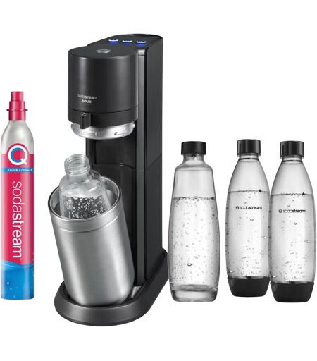 Électrique la machine à gazéifier électrique E-Duo de SodaStream gazéifie entièrement automatiquement. Une légère pression sur un bouton et votre eau est pétillante pour vous douce, moyenne ou forte - préc et individuelle ...
