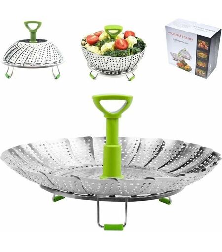 Panier vapeur réglable efficace. Vous pouvez utiliser une fourchette pour soulever le cuiseur vapeur plein de nourriture à la vapeur de vos ustensiles de cuisine. Peut être utilisé pour cuire à la vapeur des légumes, des fruits de mer, des œufs, des viandes, des desserts, des aliments pour bébé, des gâteaux, des dim sum et des boulettes, etc. Réglable : Le panier vapeur peut se replier pour le stockage et s'étendre pour s'adapter à différentes tailles de casseroles/poêles et autocuiseurs. ...