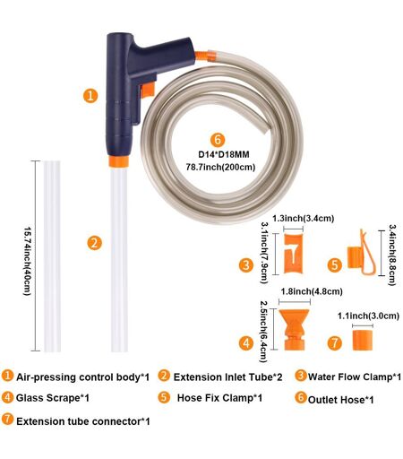 Multifonction 3 en 1:Cet outil de nettoyage pour aquarium peut être utilisé pour les changements d'eau, le lavage du sable et l'aspiration de la saleté. Pas besoin de toucher l'eau sale avec vos mains.Conception Unique:Ce nettoyeur de gravier et de sable d'aquarium est la dernière conception avec plus de puissance d'aspiration pour offrir une meilleure expérience utilisateur. La conception brevetée de la poignée offre une prise plus confortable.Longueur réglable de Conception:Nettoyer et remplir le système d'entretien de l'aquarium avec 2 rallonges pour une longueur totale de 40.9 pouces. Il peut être étendu de 22.4 pouces à 40.9 pouces. Appliqué à une profondeur inférieure à 31.5 pouces pour les aquariums.Sûr et Simple à utiliser:Pas besoin d'utiliser l'électricité, dites adieu aux chocs électriques faciles, peut être utilisé en cas de panne de courant, économie d'énergie, fonctionnement manuel pur. Il peut être utilisé facilement en appuyant six ou sept fois. Bien qu'il s'agisse d'une opération manuelle, elle est sans effort et ne prend pas de temps.Lavage de sable:Après avoir installé l'équipement, mettez-le dans l'aquarium, ne touchez pas le sable et le gravier, appuyez et absorbez l'eau jusqu'à ce que l'eau s'écoule naturellement;Ensuite, insérez le tube dur dans le sable pour absorber le sable (pas trop);Déplacer à gauche et à droite pour nettoyer le sable et le gravier;Soulever de haut en bas pour remplacer le sable et le gravier;Lavez le sable de cette façon tout le temps.Emballage Inclus:1 * corps de commande à pression d'air2 * Tube d'entrée d'extension1 * connecteur de tube d'extension1 * manuel d'utilisation;1 * entrée d'aspiration de bec de canard (vide de débris)1 * tuyau de sortie1 * pince de débit d'eau1 * montage pinceATTENTION:Le principe de ce nettoyeur de sable est la gravité. La sortie d'eau doit être au moins 19 pouces plus basse que l'entrée d'eau lorsque vous utilisez ce nettoyeur de gravier.En raison de la mesure manuelle et de la conversion de longueur, une erreur de 0.1 à 0, 5 pouces est autorisée, veuillez en nature prévalent.En raison des différentes forces de chaque personne, de la taille et de la profondeur de l'aquarium, il n'y a pas de débit de vidange clair. Veuillez vous référer à l'opération réelle.Lors du lavage du sable: si le filtre de votre aquarium est puissant, vous pouvez mettre le tuyau de sortie dans l'aquarium, et le sable fait circuler dans l'aquarium sans vidanger l'eau. Sinon, il est recommandé d'enlever l'eau trouble directement du réservoir et de changer l'eau propre.Conseil: lorsque le gravier est trop aspiré et est sur le point d'atteindre ou d'atteindre le haut du tube (près de l'orifice du filtre), soulevez légèrement le tube dur et le gravier tombera dans l'aquarium. ...