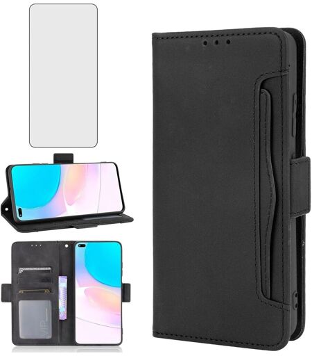 Étui Portefeuille Cuir Pu Pour Honor 50 Lite / Huawei Nova 8i - Coque Tpu Antichoc, Verre Trempé Inclus, 5 Fentes Cartes + Compartiment Billets, Support Horizontal & Sangle Poignet - Noir