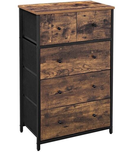 n fait attention aux détails : Pas d'inquiètude si vous avez des enfants car le design de cette commode à tiroirs en tissu a été pensé pour les petits. Le kit anti-basculement inclus assure une utilisation sure et les tiroirs en tissu ne coicent pas les doigts de vos enfants qui veulent ranger leurs vêtements par eux-mêmes. Assemblage sans problème : Avec une structure simple et des outils d'assemblage fournis, vous n'aurez pas besoin de passer tout votre dimanche après-midi à le monter. Il suffit de suivre les instructions illustrées et cette commode sera installée en un rien de temps. Caractéristiques : - Couleurs : Marron rustique, noir - Matériaux : Panneau MDF, métal, tissu non-tissé, poignée en bois - Dimensions : 56 x 30 x 89,3 cm (L x l x H) - Poids : 8,5 kg - Capacité de charge statique maximale du dessus : 15 kg - Capacité de charge statique maximale de chaque tiroir : 3 kg Livraison : - 1 x Commode - 1 x Clé Allen - 1 x Kit de montage - 1 x Mode d'emploi ...