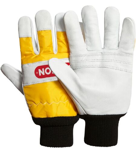 Gants de travail pour la coupe à la tronçonneuse avec protection anti-coupures sur le dessus de chaque gant. ...