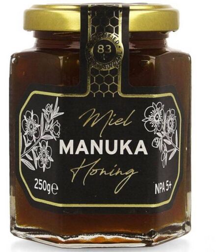 Veuillez suivre un régime alimentaire varié et équilibré et un mode de vie sain.Miel de Manuka. Un miel à la consistance ferme et aux propriétés exceptionnelles provenant du manuka, un arbuste qui pousse en Nouvelle-Zélande.Non Peroxide Activity (NPA) : 5+, un indicateur de la pureté et de la concentration de Manuka. Méthylglyoxal (MGO) : >83mg/kg, ingrédient responsable de l'activité antibactérienneComposition:100% miel de manukaValeur nutritionnelle: Le miel de Manuka est un produit naturel Valeurs nutritionnelles moyennesPour 100g Energie kJ1400 kj / 334 kcal Graisse0,8 g - dont acides gras saturés0,5 g Hydrates de carbone80,4 g - dont sucres65,4 g Protéines0,1 g Sel0,008 g Utilisation:Prêt à consommer Remarque:Le miel n'est pas recommandé pour les enfants de moins de 12 mois. Conserver hors de la portée des jeunes enfants. Conserver dans un endroit frais et sombre.Poids net:250 gFabricant: nv REVOGAN Landegemstraat 1 9031 Drongen - Belgique ...