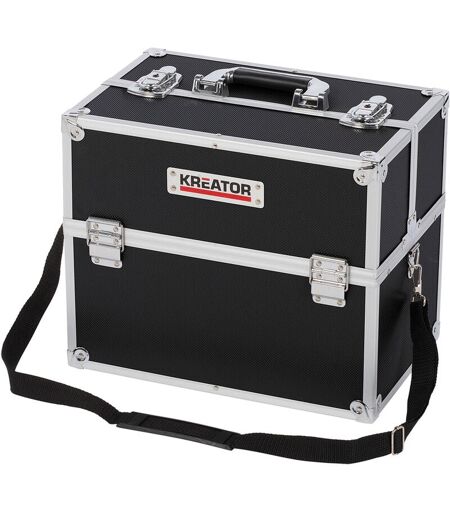 En aluminium, structure très robuste et extrêmement légère. Avec séparateurs amovibles, 4 plateaux en porte-à-faux, charnières métalliques. Serrure à clé, bandoulière. Coins renforcés. ...