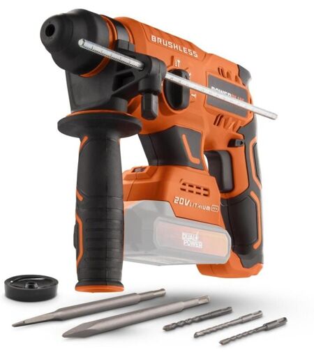 Ce marteau perforateur 20V sans fil de Dual Power avec moteur sans balais fait littéralement face à chaque matière et chaque travail. Vous pouvez l'utiliser pour le perçage, martelage, forage à percussion et ciselage en bois, pierre, acier ou briques et travaillez à 4750 coups par minute. Le moteur sans balais efficace non seulement protège la machine contre l’usure, mais fournit également une force d'impact de 3 joules. De lourds travaux de forage sont donc simples à réaliser. Cependant, aussi de légères opérations de ciselage sont possibles. Votre confort de travail a également été considéré : vous travaillez sans fil, sentez moins de vibrations et la poignée à revêtement souple se tient bien en main. La lampe de travail pratique éclaire votre zone de travail et grâce au capuchon anti-poussière vous maintenez une bonne vue. Outre le marteau perforateur Dual Power, vous trouverez aussi 3 forets, ainsi qu’un burin plat et pointu dans l’emballage. Vous pouvez donc immédiatement ...