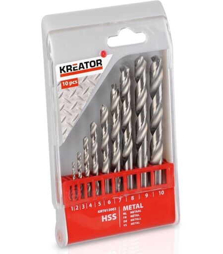 Forets pour métaux HSS Kreator en coffret de 10 mèches. Coffret 10 mèches : Diamètres 1, 2, 3, 4, 5, 6, 7, 8, 9 et 10 mm Forets cylindriques adaptables sur tous les mandrins à serrage classique. ...