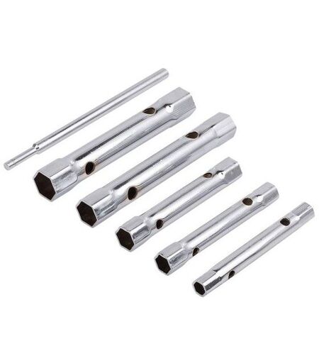 Jeu de 6 clés tubulaires de Kreator. Une clé tubulaire est idéale pour serrer des boulons et des écrous enfoncés dans une surface. Ces doubles clés ont une taille différente de chaque côté, ce qui vous offre au total 10 tailles différentes. Les 5 clés tubulaires s accompagnent en outre d une broche métallique que vous pouvez passer dans les clés à tube pour serrer plus facilement les boulons. Tailles : 8 / 9 / 10 / 11 / 12 / 13 / 14 / 15 / 17 / 19 mm ...