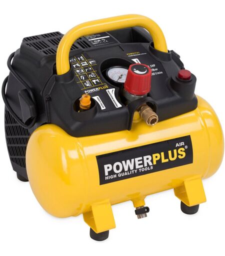 Caractéristiques techniques : Produit: Compresseur sans huile avec poignée Univers: Outillage pneumatique Contenance: 6 litres Débit d'aspiration: 180 l/min Pression maxi: 10 bars Bouton on/off Manomètre de pression Bouton de réglage de pression Sortie de condensation Vanne de sécurité Pression acoustique LpA: 77 dB(A) Puissance acoustique LwA: 97 dB(A) Tension de fonctionnement: 230 volts Longueur de câble électrique: 116 cm Fréquence: 50 Hz Puissance: 1100 watts Degré de protection INT: IP20 Classe de protection: Classe I Coloris: Noir et jaune Marque: Powerplus ...