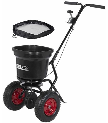 Epandeur professionnel 3 à 3,6 m 13,5 kg KRTGR9005 Idéal pour la diffusion de semences, d'engrais ou de sel. Epandage dosable avec la poignée à levier, distribution uniforme. Housse de protection pour utilisation par temps de pluie. Roues gonflables Ø 300 mm tout terrain. Capacité de la cuve : 19 L. ...