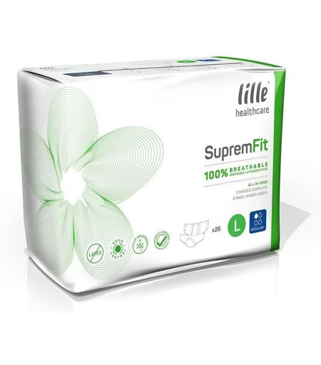 Lille Suprem Fit - Regular Plus Change complet pour incontinence urinaire et fécale : absorption moyenne. • Système d'attache très pratique qui sécurise le maintien de la couche. • Absorption renforcée par un double tampon dans la zone centrale et à l'arrière. • Barrières anti-fuites. • Voile offrant une absorption deux fois plus rapide pour un effet "garde au sec". • Témoin d'humidité. • Les odeurs sont neutralisées par la technologie Odour Control. • Silencieux, ne fait pas de bruit en marchant. Tour de hanches Absorption Capacité Conditionnement MEDIUM 80 à 130 cm Moyenne 2430 ml 26 pièces LARGE 105 à 150 cm Moyenne 2500 ml 26 pièces Gamme complète Lille Suprem Fit Absorption Regular Plus Moyenne Extra Plus Forte Super Plus Très forte Maxi Maximale Absorptions disponibles dans la gamme Lille Suprem Fit : Lille Suprem Fit Regular Plus Lille Suprem Fit Extra Plus Lille Suprem Fit Super Plus Lille Suprem Fit Maxi ...