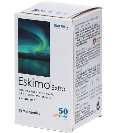 Complément alimentaire à utiliser dans le cadre d'une alimentation variée, équilibrée et d'un mode de vie sain.Eskimo® est une huile de poisson pure, stable et naturelle riche en acides gras oméga-3. 3 gélules (5 ml) d’Eskimo®-3 ou 1 gélule d’Eskimo® Extra par jour contiennent assez d’EPA et de DHA (au moins 250 mg) pour soutenir la fonction cardiaque. 5 ml d’Eskimo®-3 ou 2 gélules d’Eskimo® Extra par jour fournissent assez de DHA (au moins 250 mg) pour soutenir la fonction cérébrale et une vision normale. Eskimo® a la même composition naturelle que le poisson. L’huile n’est pas modifiée chimiquement, et a un taux naturel de 38 % d’acides gras oméga-3. De plus, des règles strictes sont respectées tout au long de la production de l’huile. Avant de mettre l’huile dans les gélules ou en bouteille, elle est soumise à un processus approfondi de purification ce qui permet de garantir un produit totalement exempt de toxines environnementales. Eskimo® est une huile de poisson ultra stable. Une technologie brevetée permet de rétablir le profil des antioxydants après le processus de purification, générant d’excellents résultats au niveau de la stabilité. Les produits Eskimo® sont non seulement stables dans la bouteille, mais aussi dans l’organisme.IngrédientsConcentré naturel d'huile de poisson 1 g (sous forme de triglycérides) Mélange de tocophérols naturels 5 mg Excipients : gélatine, glycérine, huile de limon, romarin, chlorophylleDonnées nutritionnelles Information nutritionnelle par gélule : EPA (acide eicosapentaénique) 300 mg DHA (acide docosahexaénique) 200 mg Vit. E 3 mg 30 %* * % A.J.R. = Apport journalier recommandéConseils d'utilisations1 à 2 gélules par jour ou comme conseillé. À prendre lors des repas.Précautions d'emploi- Ne pas utiliser de façon prolongée sans avis médical; - Garder hors de portée des jeunes enfants;- Lire avec attention la notice; - Demandez conseil à votre médecin ou à votre pharmacien;- En cas d’apparitions de manifestations indésirables, veuillez contacter votre médecin.Poids net50 gélulesFabricantMetagenics BelgiumEdward Vlietinckstraat 208400 OostendeBelgique ...