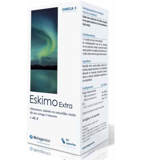 Complément alimentaire à utiliser dans le cadre d'une alimentation variée, équilibrée et d'un mode de vie sain.Eskimo® est une huile de poisson pure, stable et naturelle riche en acides gras oméga-3. 3 gélules (5 ml) d’ Eskimo®-3 ou 1 gélule d’Eskimo® Extra par jour contiennent assez d’EPA et de DHA (au moins 250 mg) pour soutenir la fonction cardiaque. 5 ml d’ Eskimo®-3 ou 2 gélules d’Eskimo® Extra par jour fournissent assez de DHA (au moins 250 mg) pour soutenir la fonction cérébrale et une vision normale. Eskimo® a la même composition naturelle que le poisson. L’huile n’est pas modifiée chimiquement, et a un taux naturel de 38% d’acides gras oméga-3. De plus, des règles strictes sont respectées tout au long de la production de l’huile. Avant de mettre l’huile dans les gélules ou en bouteille, elle est soumise à un processus approfondi de purification ce qui permet de garantir un produit totalement libre de toxines environnementales. Eskimo® est une huile de poisson ultra stable. Une technologie brevetée permet de rétablir le profil des antioxydants après le processus de purification, générant d’excellents résultats au niveau de la stabilité. Les produits Eskimo® sont non seulement stables dans la bouteille, mais aussi dans l’organisme.Ingrédientsp>Concentré naturel d'huile de poisson 1 g (sous forme de triglycérides) Mélange de tocophérols naturels 5 mg Excipients: gélatine, glycérine, huile de limon, romarin et chlorophylle Information nutritionnelle par gélule: EPA (acide eicosapentaénique) 300 mg DHA (acide docosahexaénique) 200 mg Vit. E 3 mg30%* *% A.J.R. = Apport Journalier RecommandéConseils d'utilisationsA.J.R. (Apport Journalier Recommandé) 1 à 2 gélules par jour ou comme conseillé. À prendre lors des repas.Précautions d'emploi- Ne pas utiliser de façon prolongée sans avis médical; - Garder hors de portée des jeunes enfants;- Lire avec attention la notice; - Demandez conseil à votre médecin ou à votre pharmacien;- En cas d’apparitions de manifestations indésirables, veuillez contacter votre médecin.Poids net90 capsulesFabricantMetagenics BelgiumEdward Vlietinckstraat 208400 OostendeBelgique ...