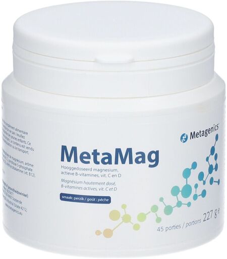 Complément alimentaire à utiliser dans le cadre d’une alimentation variée, équilibrée et d’un mode de vie sain.MetaMag Pêche 45 PortionsPréparation de magnésium hautement doséeDosage élevé en magnésium par portion: 300 mgMagnésium sous ses formes les mieux absorbées: glycérophosphate et bisglycinate de magnésium pour une absorption étalée et des taux réguliers de Mg pendant la journéeCofacteurs qui travaillent en synergie avec le magnésium: vitamines B6, B12, folate, taurine et vitamine DIngrédientsIngrédients par portionForme/composantQuantité%ARMagnésium 300 mg80% Bisglycinate de magnésium2500 mg Glycérophosphate de magnésium900 mg Vitamine B6Pyridoxal-5-phosphate2 mg143%Vitamine B12Méthylcobalamine25 mg1000%Vitamine CAcide ascorbique17,2 mg21.5%Vitamine DCholécalciférol25 µg (1000 IU)500%FolateCalcium-L-methylfolate100 µg50%Taurine 150 mg Contient aussi:Acide citriqueArôme de pêcheGlycosides de stéviolConseils d'utilisation1 portion (= 1 mesurette) par jour, à mélanger dans un verre d’eau (150 ml)Précautions d'emploiConserver dans un endroit frais et sec.Tenir hors de portée des jeunes enfants.Ne pas dépasser la dose recommandée.Poids net227 g℮FabricantMetagenicsEdward Vlietinckstraat 20,8400 OstendeBelgique ...