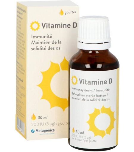 Complément alimentaire à utiliser dans le cadre d’une alimentation variée, équilibrée et d’un mode de vie sain. Soutient le système immunitaire.Maintien de la solidité des os.Contient de la vitamine D pour soutenir les défenses naturelles. Pour toute la famille Vitamine D3 (cholécalciférol) : la meilleure forme absorbable de vitamine D 5 μg par goutte : 100% de l'apport de référence Forme liquide Goût neutre Sur la base de l'huile MCT (Medium Chain Triglyceride) Composition:Triglycérides à chaîne moyenne, extraits riches en tocophérols, vitamine D (cholécalciférol). Valeur nutritionnelle: Par goutte *AJR Vitamine D (200 IU) 5 ug 100 % *Apport journalier de référence Conseil d'utilisation: Enfants : 2 gouttes par jour Adultes : 5 gouttes par jour Seniors : 10 gouttes par jour Femmes enceintes : 10 gouttes par jour Carences plus importantes : 15 gouttes par jour Précautions d'emploi:Ne pas dépasser la ose journalières recommandée. Tenir hors de la portée des enfantsPatients souffrant d'insuffisance rénale, d'hypercalciémie, hypercalciurie: Consultez votre médecin.Conserver dasn un endroit frais et sec. Poids net:30 ml Fabricant:Metagenics BelgiqueEdward Vlietinckstraat 208400 Oostende ...