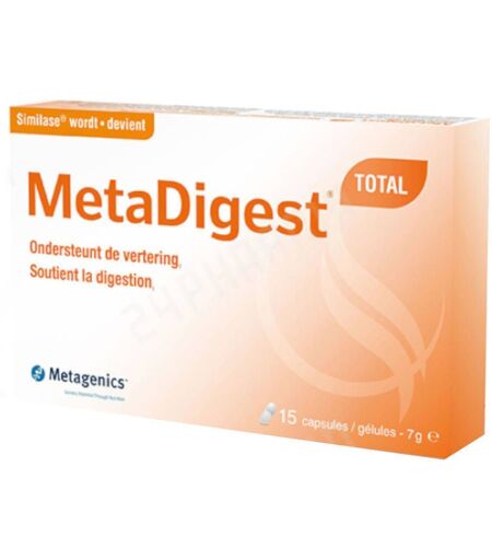 Complément alimentaire à utiliser dans le cadre d’une alimentation variée, équilibrée et d’un mode de vie sain.MetaDigest® Total soutient la digestion1 rapidement de manière naturelle. Les enzymes et l’extrait de gingembre1dans MetaDigest® Total sont d’origine naturelle. Ils soutiennent la fonction des enzymes omniprésentes dans notre système digestif lors de la digestion des aliments. Les enzymes ‘découpent’ les macronutriments (glucides, lipides et protéines) en petits morceaux de sorte que notre organisme puisse mieux les absorber.Il existe de nombreuses situations où la digestion mérite un petit coup de main: Pendant ou après un repas copieux Lors de la modification des habitudes alimentaires Alimentation végétarienne ou végétalienne Diète d’amincissement Diète cétogène ou protéinée Voyages à l’étranger Lors de la prise d’antiacides Lors d’efforts sportifs Composition:Excipients: hydroxypropylméthylcellulose (gélule), antiagglomérants: silice et sels de magnésium d’acides gras.Valeur nutritionnelle: Par gélule Protéase 41000 FCC unités Cellulase 1750 FCC unités Amylase 1400 FCC unités Alpha galactosidase 300 FCC unités Maltase 16050 FCC unités Lactase 340 FCC unités Lipase 1050 FCC unités Invertase 150 INVU Fytase 0,85 PU Lécithine de soja 50 mg Rhizome de gingembre (Zingiber officinalis) 25 mg Conseil d'utilisation:1 gélule pendant ou juste après le repas.Précautions d'emploi:Veuillez bien respecter l’apport journalier recommandé. Garder hors de la portée des jeunes enfants. L’utilisation pour les enfants de moins de 6 ans n’est pas autorisée. Non recommandé aux femmes enceintes. Conserver à l’abri de la chaleur et de l’humidité. Poids net: 7 g = 15 gélules Fabricant: MetagenicsEdward Vlietinckstraat 208400 Oostend ...