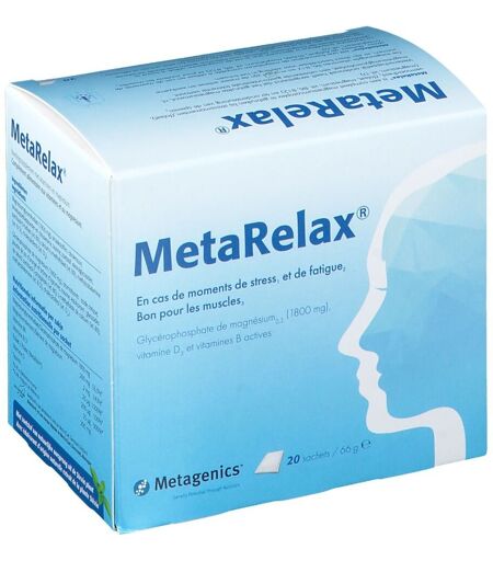 Complément alimentaire à utiliser dans le cadre d’une alimentation variée, équilibrée et d’un mode de vie sain.MetaRelaxC’est quoi le MetaRelax®? MetaRelax® est un complément alimentaire complet apportant du magnésium et aide en cas de moments de stress (folate)1 et de fatigue (folate, magnésium, viamines B6, B12)2 et lors de tensions musculaires (magnésium, vitamine D)3. MetaRelax® est sûr pour chacun. Convient aussi aux enfants, sportifs, femmes enceintes, personnes âgées. Le folate contribue à une fonction psychologique normale, telle que la résistance au stress. Le folate, le magnésium et la vitamine B6 contribuent à diminuer la fatigue. Le magnésium et la vitamine D contribuent à une fonction musculaire normaleAction rapideLa formule la plus efficace : magnésium, vitamine B, D, folate et taurine. Pas de plaintes gastro-intestinalesForme de magnésium organique. Pas d’effet laxatif. Usage facile1 sachet par jour Usage sûr pour tousConvient aussi aux enfants, aux femmes enceintes, personnes âgées et aux sportifs.IngrédientsGlycérophosphate de magnésium (1800 mg), aromatisants : acide citrique, arôme d'agrumes et poudre de jus d'orange, taurine, agent de charge : carbonate de magnésium, édulcorant : glycosides de stéviol provenant de la stévia, vitamine D (cholécalciférol), vitamine B6 (pyridoxal-5-phosphate), agents de charge : phosphate dicalcique et dioxyde de silicium, folate (L-méthylfolate de calcium), vitamine B12 (méthylcobalamine) Données nutritionnellesINGRÉDIENTS PAR SACHET :Glycérophosphate de magnésium 1800 mgMagnésium 200 mg (53,4 %*)Vitamine B6 (pyridoxal-5-phosphate) 2 mg (53,4 %*)Vitamine B12 (méthylcobalamine) 25 µg (1000 %)* (méthylcobalamine)Vitamine B9 (folate) 200 µg (100 %*)Taurine 200 mgVitamine D (cholécalciférol) 25 µg (500 %) 1000 UI* %AJR = Apport Journalier Recommandé (C.E.)Conseils d'utilisationUn sachet, dissous dans l'eau.Précautions d'emploi Conserver dans un endroit frais et sec. Tenir hors de portée des jeunes enfants. Ne pas dépasser la dose recommandée.Poids net20 sachets = 66 g ?FabricantMetagenicsEdward Vlietinckstraat 20,8400 OstendeBelgique ...