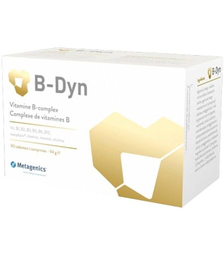 Complément alimentaire à utiliser dans le cadre d’une alimentation variée, équilibrée et d’un mode de vie sain.B-DynB-Dyn® contribue au fonctionnement normal du système nerveux et à un équilibre normal des fonctions psychologiques (vit. B1, B3, B6, B12, biotine). B-Dyn® aide aussi à réduire la fatigue (vit. B2, B3, B5, B6, B12), et participe au métabolisme normal de l’homocystéine (folate, vit. B6, B12, choline).Les vitamines B1, B2, B3, B5, B6, B12 et la biotine soutiennent le taux d’énergie.Large spectre : 8 vitamines B et 3 substances apparentées aux vitamines B (choline, inositol et APAB).Sous des formes actives, bien absorbées : directement disponibles pour être utilisées. Le corps ne doit plus les transformer.Haut dosage en vitamine B12 par comprimé: 500 μg.Haute tolérance.Poids net :93 gIngrédientsIngrédients par compriméForme/composantQuantité%ARVitamine B1Chlorhydrate de thiamine4,2 mg382 %Vitamine B2Riboflavine-5-phophate de sodium4,8 mg343 %Vitamine B3 - NiacineNiacinamide54 mg338 %Vitamine B5 - Acide pantothéniquePantothénate de calcium18 mg300 %Vitamine B6Pyridoxal-5-phosphate6 mg429 %Vitamine B12Méthylcobalamine500 µg20 000 %FolateCalcium-L-methylfolate400 µg200 %Biotine 450 µg900 %CholineBitartrate de choline82,5 mg Inositol 50 mg APABAcide para-aminobenzoïque50 mg Contient aussi : Cellulose microcristalline, Maltodextrine, Hydroxypropylcellulose, Acide stéarique, Carboxyméthylcellulose de sodium réticulée, Silice, Sels de magnésium d'acides gras.Conseils d'utilisation1 comprimé par jour.Précautions d'emploiConserver dans un endroit frais et sec.Tenir hors de portée des jeunes enfants.Ne pas dépasser la dose recommandée.Poids net90 comprimésFabricantMetagenicsEdward Vlietinckstraat 20,8400 OstendeBelgique ...