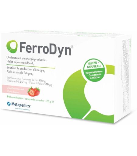 Complément alimentaire à utiliser dans le cadre d’une alimentation variée, équilibrée et d’un mode de vie sain.FerroDynMetagenics Ferrodyn est un complément alimentaire à base de fer et de vitamine B, sous la forme de comprimés.Il contribue à la formation des globules rouges, la production d'énergie et aide à lutter contre la fatigue.IngrédientsMaltulose de fer*, fumarate de fer, arôme de fraise, édulcorant : xylitol, arôme de vanille ; adjuvant : cellulose d'hydroxypropyl ; colorant : betterave rouge en poudre ; épaississant : gomme de guar ; antiagglomérants : acide stéarique, dioxyde de silicium et stéarate de magnésium ; arômes : acide citrique, pyridoxal 5' phosphate ; édulcorants : sucralose et glycosides de stéviol, L-méthylfolate de calcium. Avec des sucres et des édulcorants.* Source de glucose et de fructoseDonnées nutritionnellesComposition par comprimé à mâcher : Fer : 14 mgFumarate de fer : 45 mgFolates : 100 µgVitamine B6 (pyridoxal 5' phosphate) : 0,7 mgConseils d'utilisation1 comprimé à mâcher par jour ou comme indiqué par le médecin.Précautions d'emploiConserver dans un endroit frais et sec.Tenir hors de portée des jeunes enfants.Ne pas dépasser la dose recommandée.Poids net84 comprimés à croquerFabricantMetagenicsEdward Vlietinckstraat 20,8400 OstendeBelgique ...