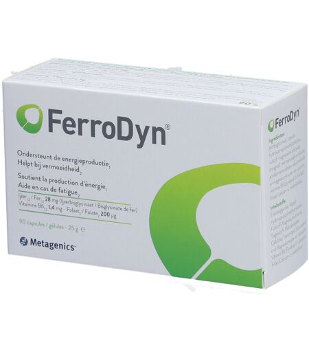 Complément alimentaire à utiliser dans le cadre d’une alimentation variée, équilibrée et d’un mode de vie sain.Ferrodyn High ImpactFerroDyn® contient du fer qui soutient la formation de globules rouges, la production d'énergie et qui aide en cas de fatigue.IngrédientsIngrédientFormeQuantité% RIFer 28 mg200 %* Bisglycinate ferreux175 mg Vitamine B6Pyridoxal-5-phosphate1,4 mg100 %*FolateCalcium-L-methylfolate200 µg100 %*ExcipientsGélule: HydroxypropylméthylcelluloseCellulose microcristallineDioxyde de siliciumSels de magnésium d'acides grasCarbonate de magnésiumConseils d'utilisation1 gélule par jour ou comme conseillé.Précautions d'emploiConserver dans un endroit frais et sec.Tenir hors de portée des jeunes enfants.Ne pas dépasser la dose recommandée.FerroDyn ne doit être utilisé qu'en cas de carence en fer.Poids net90 gélulesFabricantMetagenicsEdward Vlietinckstraat 20,8400 OstendeBelgique ...