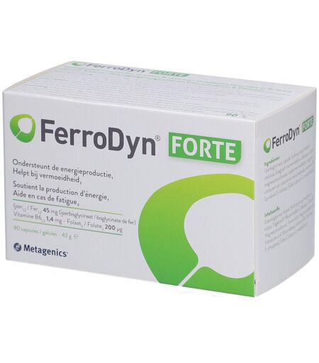 Complément alimentaire à utiliser dans le cadre d’une alimentation variée, équilibrée et d’un mode de vie sain.FerroDyn ForteForme bien absorbée de fer: bisglycinate de fer (chélate)Fer bivalent (Fe2+): absorption optimale ; la seule forme qui peut être absorbée par le corpsBonne tolérance gastro-intestinaleVitamine B6 et folate sous une forme active : directement disponible pour action dans le corpsAutorisé lors de la grossesse et lors de la lactationIngrédientsIngrédientFormeQuantité% ARFer 45 mg321 %* Bisglycinate ferreux286 mg Vitamine B6Pyridoxal-5-phosphate1,4 mg100 %*FolateCalcium-L-methylfolate200 µg100 %*ExcipientsGélule: HydroxypropylméthylcelluloseCellulose microcristallineDioxyde de siliciumSels de magnésium d'acides grasCarbonate de magnésiumConseils d'utilisation1 gélule par jourPrécautions d'emploiConserver dans un endroit frais et sec.Tenir hors de portée des jeunes enfants.Ne pas dépasser la dose recommandée.Autorisé lors de la grossesse et lors de la lactationSans glutenSans lactoseSans sojaConvient aux végétariens et végétaliensPoids net90 gélulesFabricantMetagenicsEdward Vlietinckstraat 20,8400 OstendeBelgique ...