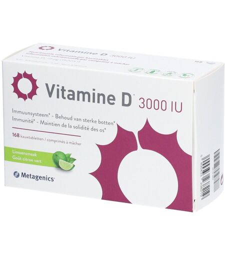 Complément alimentaire à utiliser dans le cadre d’une alimentation variée, équilibrée et d’un mode de vie sain.Complément alimentaire à base de vitamine D. En cas de déficits plus importantsHaut dosage : 75 μg par comprimé à mâcher (1500 % de l’apport journalier recommandé)Vitamine D3 (cholécalciférol) : forme la mieux absorbée de vitamine DGoût agréable de citron vert avec l’édulcorant naturel de la plante StéviaComprimés à mâcher pour un usage facileLa vitamine D contribue au maintien d'une ossature normale et au fonctionnement normal du système immunitaire.Poids net: 168 comprimés à mâcher = 42 gBénéficesHaut dosage : 75 ?g par comprimé à mâcher (1500 % de l’apport journalier recommandé)Vitamine D3 (cholécalciférol) : forme la mieux absorbée de vitamine DGoût agréable de citron vert avec l’édulcorant naturel de la plante StéviaComprimés à mâcher pour un usage facileIngrédientsÉdulcorants : mannitol et xylitol, antiagglomérant : caroxyméthylcellulose sodique, agent aromatisant : poudre de jus de citron vert (Citrus aurantifolia), support : hydroxypropylcellulose, agents aromatisants : arôme de citron vert et acide citrique, antiagglomérant : sels de magnésium d'acides gras, arôme, antiagglomérant : silice, édulcorant : glycosides de stéviol, cholécalciférol.Ingrédients par comprimé à mâcherVitamine D3 (cholécalciférol) 75 μg (1500%*)*% AR : Apport de référenceDonnées nutritionnelles 2 gélules Minéraux : Silicium (acide orthosilicique stabilisé à la choline/ch-OSA) 10 mg Autre : Choline (acide orthosilicique stabilisé à la choline/ch-OSA) 200 mg Conseils d'utilisations1 comprimé à mâcher.Précautions d'emploiCe produit est un complément alimentaire.Ne pas dépasser la dose journalière recommandée.Tenir hors de portée des jeunes enfants.Ce complément alimentaire ne convient pas aux enfants de moins de 10 ans.Autorisé lors de la grossesse et lors de la lactationSans gluten, convient aux personnes intolérantes au gluten.Sans lactose, convient aux personnes souffrant d'intolérance au lactose.Sans soja, convient aux personnes allergiques au soja.Convient aux végétariensPoids net42 g = 168 comprimés à mâcherFabricantMetagenicsEdward Vlietinckstraat 208400 OostendeBelgië ...