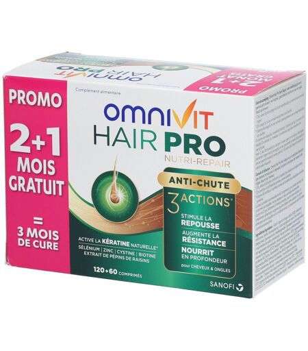 Complément alimentaire à utiliser dans le cadre d’une alimentation variée, équilibrée, d’un mode de vie sain.Cheveux cassants, abîmés, fragiles… De nombreuses femmes voudraient avoir des cheveux et des ongles plus forts, plus résistants, plus sains. Avec Omnivit Hair Pro Nutri-Repair, c’est une véritable cure de santé que vous leur offrez. 94% des femmes sont satisfaites des résultats ! *Stimulez la repousse, la santé et la résistance de vos cheveux et onglesPeur de la perte et de la chute des cheveux ? Avec Omnivit Hair Pro Nutri-Repair, c’est une véritable cure de santé que vous leur offrez. 94% des femmes sont satisfaites des résultats ! *Omnivit Hair Pro Nutri-Repair contient de nombreux éléments naturels nécessaires à la pleine santé des cheveux et des ongles : Sélénium, Zinc, Cystine, Biotine… et des extraits de pépins de raisin. En les nourrissant en profondeur, et en activant la kératine naturelle, ils améliorent la résistance, la repousse et la santé des cheveux et des ongles.**** Zinc contribue au maintien d’une chevelure & d’ongles normaux et participe à la synthèse des protéines, comme la kératine.*Source : enquête Omnivit via internet auprès de 115 femmes belges, juin 2011. N = 115 répondants ayant suivi la cureIndication:Adultes et adolescents à partir de 12 ans.Femmes enceintes : pas de contre-indication.Composition:Par 2 comprimés : Vitamine B3 12 mg, Vitamine B6 4,2 mg, Vitamine B8 0,06 mg, Sélénium 68,75 µg, Zinc 15 mg, Méthionine 600 mg, Cystine 350 mg, Extrait de pépins de raisin 150 mg.Valeur nutritionnelle:VITAMINES / MINÉRAUX Quantité (2 comprimés)AJR*Vitamine B3 = Vitamine PP12 mg75%Vitamine B64,2 mg300%Vitamine B80,06 mg120%Sélénium (Se)68,75 µg125%Zink (Zn)15 mg150%AUTRES Quantité (2 comprimés)AJR*Méthionine600 mg Cystine350 mg Extrait de pépins de raisins(Vitis vinifera L.)150 mg * AJR = Apport journalier de référenceConseil d'utilisation:2 comprimés par jour pendant le repas, avec un peu d’eau. Etant donné le cycle de croissance du cheveu, il est conseillé de prendre Omnivit Hair Pro Nutri-Repair pendant 2 mois au moins.Précautions d'emploi:Ce produit contient du sorbitol, une consommation excessive peut avoir des effets laxatifs. L’E122 peut avoir un effet négatif sur l’activité et l’attention chez les enfants. Ne pas dépasser la dose journalière recommandée. Les comprimés sont sécables. Convient aux adultes et aux enfants à partir de 12 ans. La prise doit être limitée à quelques semaines/mois.Poids net:203,22 g = 180 comprimésFabricant:SanofiLeonardo da Vincilaan 19/B1831 MachelenBelgique ...