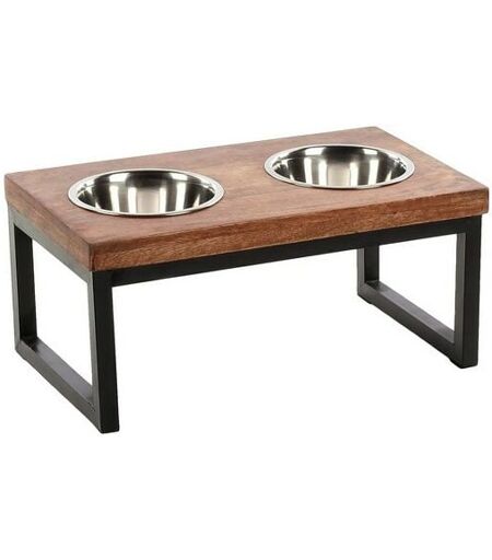 Nourrisseurs avec support de gamelle pour chiens Support double gamelle avec plateau en bois de manguier avec un chassis en métal avec finition noire. Les deux gamelles en inox sont amovible. Le chassis est équipé de protection pour éviter de griffer le sol. Existe en 4 contenances et dimensions selon le gabarit de votre chien. ...