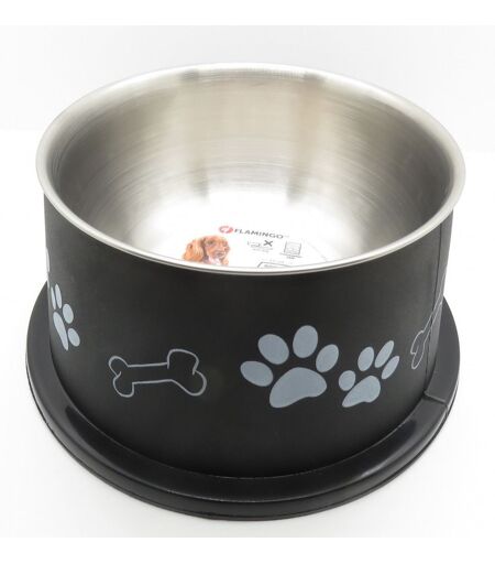 Ecuelle Kena . pour chien à oreilles longues . dimension: ø15 cm. contenance 900 ml. hauteur: 9.5 cm. en inox. antidérapant. couleur noir. avec motif pattes et os. ...