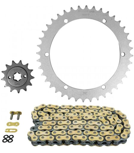 Kit chaine de transmission neuf de marque Afam (démultiplication identique à l'origine). Ce kit comprend : - Une couronne acier 40 dents, alésage 152mm, 6 trous Ø8.4mm entre axe 164mm - Un pignon de 13 dents (Ø16/20mm) - Une chaine à joints toriques A520XRR3-G super renforcée 92 maillons au pas 520 - Une attache rapide semi-pressée Vendu à l'unité. Livré conforme à la photo. ...