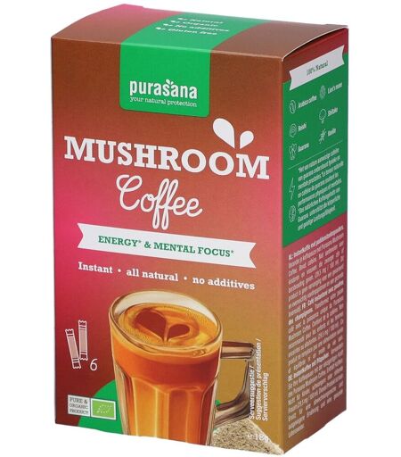 Il est important d'avoir une alimentation variée et équilibrée et un mode de vie sain.À propos du Café aux ChampignonsRéinventez votre rituel café avec le Café aux Champignons Purasana. Cette boisson associe la douceur du café Arabica au Lion’s mane, au Reishi et au Shiitake. Avec un boost naturel d'énergie grâce au guarana, ce café est parfait pour commencer votre journée ou maintenir votre concentration pendant une journée bien remplie.Les avantages du Café Champignons100 % biologique et naturel : fabriqué avec des ingrédients certifiés biologiques, sans additifs synthétiques.Superaliments sains et fonctionnels :Le guarana soutient les performances physiques et mentales.Le Lion’s mane, reishi et shiitake contribuent à l’équilibre et au bien-être grâce à leurs propriétés adaptogènes.Une expérience gustative riche : la douceur du café Arabica est sublimée par des notes terreuses de champignons et une touche de vanille.Pratique et frais : les sticks préservent la qualité et permettent une préparation facile.Pour qui est le Café Champignons ?Le Café Champignons Purasana est idéal pour :Ceux qui recherchent énergie et concentrationLes amateurs de cafés naturels et uniquesLes consommateurs soucieux de leur santé qui préfèrent des options biologiquesComment utiliser le Café Champignons ?Ajoutez un stick à 200 ml d’eau chaude, mélangez bien et dégustez. Pour une saveur plus douce, ajoutez du lait ou une alternative végétale.QualitéCertifié biologique : uniquement des ingrédients de qualité biologique.Fraîcheur optimale : les sticks protègent contre la lumière et l'air pour garantir la qualité.Sans allergènes : sans gluten, soja ni additifs synthétiques.Le Café Champignons Purasana allie saveur, énergie et bien-être – parfait pour les amateurs de café moderne !IngrédientsCafé instantané* (60 %), crinière de lion*, shiitaké*, reishi*, guarana*, arôme naturel de vanille*. *Issu de l’agriculture biologique.Valeurs nutritionnellesValeurs nutritionnellesPar portion :Énergie39 kJ / 9 kcalMatières grasses0 gDont acides gras saturés0 gGlucides1,2 gDont sucres0,1 gFibres1 gProtéines0,6 gSel0 gCaféine60 mgConseils d'utilisationVersez le contenu d'un sachet. Ajoutez 200 ml d'eau juste bouillie. Remuez vigoureusement et attendez 30 secondesPrécautions d'emploiContient de la caféine. Non recommandé pour les enfants et les femmes enceintes ou allaitantes. (29,5 mg / 100 ml).Les informations fournies ne constituent pas un avis médical.Conserver dans un endroit frais et sec.Poids net6 x 3 g℮Adresse du FabricantPurasana NVHeulestraat 1048560 WevelgemBelgique ...