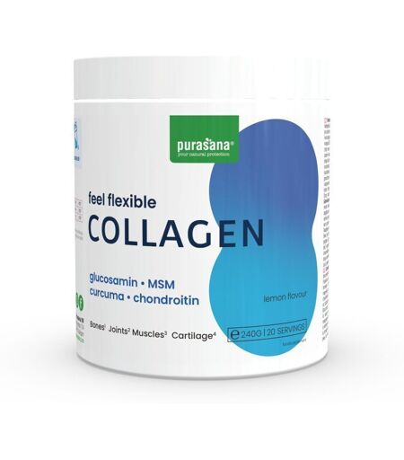 Complément alimentaire à utiliser dans le cadre d’une alimentation variée, équilibrée et d’un mode de vie sain.Feel Flexible Joint Collagen du laboratoire Purasana est un complément alimentaire contribuant à la bonne santé des articulations, des os et des cartilages.Le collagène est l'une des protéines structurelles les plus importantes dont votre corps a besoin.Cette poudre, au goût savoureux de citron, offre une combinaison de collagène bovin de types I et III, de vitamine C, de glucosamine, de chondroïtine, de curcuma, d'acide hyaluronique et de magnésium pour les os et les articulations.CuroWhite® est une poudre brevetée de racine de curcuma. Son goût, sa couleur et son odeur sont totalement neutres, contrairement aux poudres de curcuma classiques. Il contient les trois principaux composants de la curcumine, le principe actif du curcuma, immédiatement sous la forme adéquate pour être absorbée par l'organisme.La formule articulaire contient également de l'acide hyaluronique, de la chondroïtine, de la glucosamine et du MSM. Ces substances sont naturellement présentes dans les articulations.Avec 45 % de protéines, le collagène Feel Flexible lemon est riche en protéines qui contribuent à la croissance de la masse musculaire et au maintien d'os solides.IngrédientsPeptides de collagène hydrolysés, sulfate de D-glucosamine 2KCI (végétalien), gomme d'acacia (épaississant), citrate de magnésium, arôme naturel de citron, citron (Citrus limon), sulfate de chondroïtine, MSM (méthyl-sulfonylméthane), CuroWhite® (extrait de racine de Curcuma longa), régulateur d'acidité : Acide citrique, vitamine C (acide L-ascorbique), édulcorant (sucralose) et citrate de manganèse. Contient naturellement de la SULFITE.Allergènes : Sulfite.Valeurs nutritionnelles Pour 1 portionSulfate de D-Glucosamine : 1178 mgSulfate de chondroïtine : 800 mgMSM (méthylsulfonylméthane) : 500 mgCurcuma (CuroWhite®) : 250 mgMagnésium : 150 mg (40%*)Vitamine C : 40 mg (50%*)Manganèse : 1 mg (50%*)Conseils d'utilisationUtilisez une portion de 12 g par jour pour des résultats optimaux. Mélangez la poudre de collagène bovin avec de l'eau, des shakes, des smoothies et des yaourts. Avec le goût frais du citron !Précautions d'emploiLa dose journalière recommandée ne doit pas être dépassée. Les compléments alimentaires ne remplacent pas une alimentation équilibrée et variée ni un mode de vie sain. Tenir hors de portée des jeunes enfants. Consultez votre médecin ou votre pharmacien en cas d’usage concomitant d’anticoagulants. Présence naturelle des sulfites.Poids net240 g - 20 portionsAdresse du FabricantPurasana NVHeulestraat 104 8560 GullegemBelgique ...