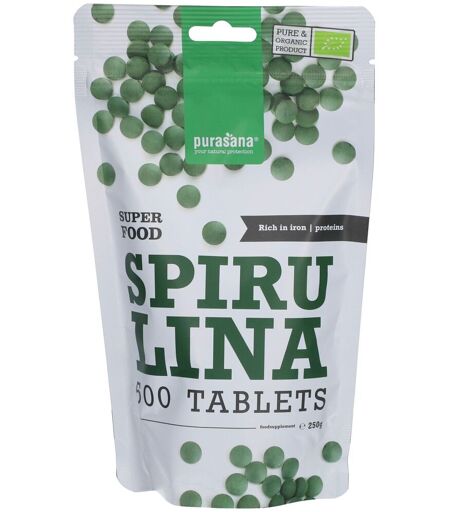 La spiruline est une algue microscopique d'eau salée qui appartient aux cyanobactéries (algues bleu-vert). La spiruline est colorée par la phycocyanine, un pigment bleu.IngrédientsSpirulina platensis* (algue) : 500 mg. *Issu de l'agriculture biologique.Valeurs nutritionnelles / 100 g / 3 g (6 tablettes) Énergie 343 kcal (1435 kJ) 10,3 kcal (43,1 kJ) Matières grasses 1,9 g 0,1 g Dont acides gras saturés 0,1 g 0,0 g Glucides 12,6 g 0,4 g Dont sucres 0,1 g 0,0 g Fibres 9,4 g 0,3 g Protéines 63,3 g 1,9 g Sel 0,2 g 0,01 g Fer 130,8 mg (934%*) 3,92 mg (28%*) *Valeurs nutritionnelles de référenceConseils d'utilisationPrends 6 comprimés par jour avec un grand verre d'eau. Vous pouvez répartir la prise en 2 temps, par exemple le matin et le soir. 1 comprimé contient 500 mg de spiruline.Précautions d'emploiTenir hors de portée des jeunes enfants. Les compléments alimentaires ne doivent pas être utilisés comme substitut d'une alimentation variée et équilibrée et d'un mode de vie sain. Ne pas dépasser la dose recommandée.Poids net500 comprimés = 250 gAdresse du FabricantPurasanaFlinndal Nederland B.V.Oerkapkade 52031 EN ...