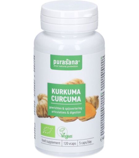 Complément alimentaire à utiliser dans le cadre d’une alimentation variée, équilibrée et d’un mode de vie sain.Le curcuma contribue au maintien de la souplesse des articulations et – en tant qu'antioxydant – il aide à protéger les cellules du corps contre les influences extérieures (à partir de 300 mg par jour). De plus, le curcuma stimule l'appétit à partir de 1 gramme par jour.Qu'est-ce que le curcuma ?Le curcuma est une épice couramment utilisée dans la cuisine asiatique et utilisée de plus en plus souvent dans la cuisine néerlandaise. Il a un goût de curry et donne aux plats une couleur jaune. Le curcuma est également appelé ‘racine jaune’, car il s’agit de la racine jaune du Curcuma Longa.Pourquoi utiliser les comprimés de curcuma ?La racine du Curcuma Longa contient des curcuminoïdes. Ce sont des substances végétales qui ont un effet positif sur le corps. Elle est reconnue comme un antioxydant, qui contribue à rendre les articulations plus souples et favorise la digestion.Pour des articulations souples Soutient le système immunitaire en tant qu'antioxydant Stimule l'appétitComposition:Curcuma* (racine) : 325 mgGélule : gélifiant végétal (hydroxypropylméthylcellulose) * d'origine biologique.Valeur nutritionnelle: Pour 6 gélulesCurcuma longa1950 mgConseil d'utilisation:Au maximum 4 à 6 gélules par jour. À prendre de préférence après le repas avec un verre d'eau.Précautions d'emploi:La dose quotidienne recommandée indiquée ne doit pas être dépassée. Tenir hors de portée des jeunes enfants. Ne convient pas aux personnes ayant des calculs biliaires. Ne convient pas aux personnes souffrant d'ulcère d'estomac, d'ulcère duodénal. Consultez votre médecin lorsque vous prenez des anticoagulants.Poids net:120 gélulesFabricant:PURASANA NVHeulestraat 1048560 GULLEGEM ...