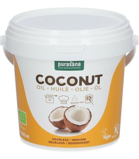 Il est important d'avoir une alimentation variée et équilibrée et un mode de vie sain.L'huile de coco désodorisée est fabriquée à partir de la chair de noix de coco séchée. Cette chair est ensuite pressée, raffinée, filtrée, désodorisée et blanchie pour obtenir l’huile de coco. L'huile de noix de coco convient à la friture à une température plus basse, de sorte qu'elle dure jusqu'à 5 fois plus longtemps qu'une huile de friture ordinaire. De plus, l'huile de coco est moins susceptible à l'oxydation et les frites préparées dans l’huile de coco ont un goût particulièrement doux et délicat.N'a pas l'odeur ni le goût de la noix de cocoFrire, cuire, rôtir et cuisiner au wok de manière saineL'huile de noix de coco est moins sensible à l'oxydationComposition :Huile de noix de coco pure issue de culture biologique* (*BE-BIO-02).Valeur nutritionnelle : Pour 100 gValeur énergétique3700 kJ /900 kcalMatières grassesdont acides gras saturés100 g91,6 gGlucides dont sucres0 g0 gFibres alimentaires0 gProtéines0 gSel0 g Conseil d'utilisation :Pour frire ou pour cuisiner vos plats. Essayez de filtrer l'huile de coco régulièrement. La température désirée pour chauffer l’huile de coco est de 160°C. Au-dessus de 180°C, une mousse se forme dans l'huile. Ne mélangez jamais l'huile de coco avec une autre huile. L'huile de noix de coco désodorisée est également disponible en seau de 500 ml.Préacautions d'emploi :Conserver au frais, au sec et à l’abri de la lumière.Poids net :500 mlFabricant :Purasana NVHeulestraat 104 8560 GullegemBelgique ...