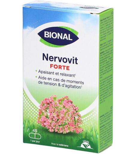 Complément alimentaire à utiliser dans le cadre d’une alimentation variée, équilibrée et d’un mode de vie sain.Moments de tension ou d'irritabilité ? Bional Nervovit Forte est spécialement formulé pour vous aider en cas de moments de tension et d'irritabilité. Nervovit Forte contient un extrait concentré de valériane. Cet extrait naturel vous aide à faire face au stress quotidien, a un effet calmant sur l'irritabilité et contribue à une relaxation optimale*. À la valériane :Effet apaisant et relaxant*Aide en cas de moments de tension & d'irritabilité*Vegan* Allégations de santé en attente d’approbation par l’EFSA.IngrédientsExtrait de racine de valériane (Valeriana officinalis); agents de charge: cellulose microcristalline, hydroxypropylméthylcellulose, hydroxypropylcellulose; antiagglomérants: stéarate de magnésium, acide stéarique, dioxyde de silicium; humectant: carboxyméthylcellulose de sodium réticulée; colorant: oxyde de fer; stabilisant: bêta-cyclodextrine, arômes.Conseils d'utilisationAdultes : 1-2 comprimés durant la journée avec de l'eau. Ou 1-2 comprimés une heure avant le coucher. Déconseillé aux enfants de moins de 12 ans.Précautions d'emploiNe pas dépasser la dose recommandée. Un complément alimentaire ne doit pas se substituer à une alimentation variée et équilibrée et à un mode de vie sain. Garder à température ambiante. Tenir hors de portée des jeunes enfants. Déconseillé aux enfants de moins de 12 ans.Poids net45 comprimésAdresse du FabricantFytofarma S.A.Kooigembosstraat 1,8510 CoutraiBelgique ...