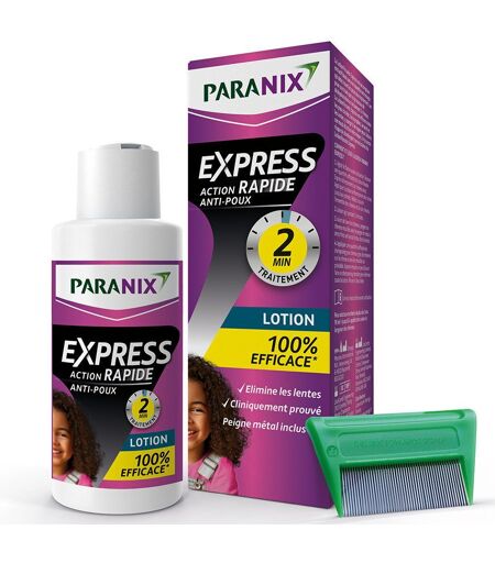 Paranix Express Action Rapide 2 minutes Lotion Anti-Poux 195 ml offre une solution rapide et efficace pour éliminer les poux de tête, les nymphes et les œufs. Grâce à sa formule spéciale, elle agit en seulement deux minutes, permettant d'éliminer 100 % des poux et des nymphes dès la première application. Des études in-vitro ont démontré cette efficacité, et une étude in-vivo a confirmé qu'aucun parasite vivant n'a été retrouvé après usage. Dans certains cas, un second traitement peut être utile, sans remettre en question les performances du produit. Facile à utiliser, cette lotion puissante assure une action en profondeur pour un traitement complet. Elle simplifie considérablement le processus, évitant les longues heures de soin, ce qui en fait une solution pratique et rassurante pour les parents. Testé sous contrôle dermatologique.1. Agiter le flacon avant utilisation. Déposer une quantité suffisante de lotion sur cheveux secs. Appliquer la lotion uniformément uniformément des racines jusqu'aux pointes. Veiller à couvrir l'ensemble des cheveux et du cuir chevelu. 2. Laisser agir pendant 2 minutes. 3. Avant de laver les cheveux, peigner les cheveux mouillés avec le peigne en métal à dents fines anti-poux. 4. Appliquer une quantité suffisante de shampoing pour cheveux gras directement sur les cheveux sans les mouilles au préalable. Ajouter ensuite un peu d'eau et faire un shampoing complet pour éliminer toute la lotion. Rincer à l'eau tiède. ...