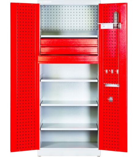 DESCRIPTION: Armoire haute universelle avec différentes possibilités de rangement. Caractéristiques : Panneau arrière et portes perforés 3 tiroirs 4 tablettes d'une capacité de 50 kg, réglables en hauteur Construction robuste en acier soudé Serrure à 2 points Peinture époxy ...