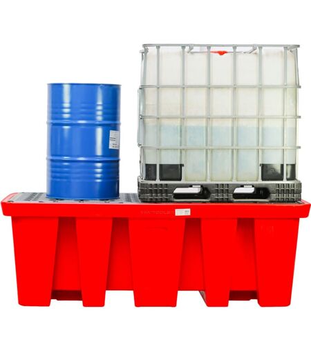 DESCRIPTION: Bac de rétention en HDPE rouge Convient pour 2 IBC's de 900 lt chaucun ou 1 IBC de 1100 lt et 4 fûts de 175 lt Equipé d'une grille amovible en PEHD noir à travers laquelle le liquide peut s'écouler. Ce bac de rétention convient à tous les liquides et résiste à tous les produits chimiques. Le nettoyage du bac est facile grâce au plastique HDPE de haute qualité. Caractéristiques: Capacité de collecte: 2200 lt Capacité de charge maximale: 3000 kg Muni de 4 passages de fourches pour déplacement facile Dimensions: 2340x1300x750mm Capacité conforme aux normes de l'environnement wallonnes, flamandes (Vlarem), néerlandaises (PGS15) et françaises. ...