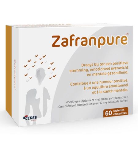 Complément alimentaire à utiliser dans le cadre d'une alimentation variée, équilibrée et d'un mode de vie sain.Pendant les périodes d'émotions, le safran utilisé dans ZafranPure 30 mg, contribue à une humeur positive, à l'équilibre émotionnel et à la santé mentale*.* Allégations de santé en attente d'approbation par l'EFSA.Contient l’extrait de safran breveté Safr’Inside™Efficacité cliniquement prouvée pour les états dépressifsEffet prouvé sur la sérotoninePremiers effets sensibles après deux semainesPas d’accoutumanceTrès bonne tolérance à la dose recommandée, pas de toxicitéPas d’effet secondaire connuChoix entre 30 mg et 60 mg de safran (version Forte)Ne contient pas de gluten, de soja, de lactose ni de sucreContenu :60 comprimésIngrédientsPAR COMPRIMÉ :Safran30 mg dont 2 % safranal 0,6 mgAgent de charge (cellulose microcrystalline), extrait de Safran (Crocus sativus, fleur), agent d’enrobage (hydroxypropylméthylcellulose), antiagglomérant (sels de magnésium d’acides gras, dioxyde de silicium, silicate de magnésium), agent d’enrobage (polydextrose), triglycérides à chaînes moyennes, colorants (carmins, indigotine) Conseils d'utilisations1 comprimé per jour, pendant le repas.Premiers effets perceptibles après 2 semaines. Effet thérapeutique complet après 4 à 6 semaines. Pour obtenir le meilleur effet possible, il est recommandé de prendre Zafranpure® pendant au moins 3 mois.Précautions d'emploiConserver dans un endroit frais et sec.Ne pas dépasser la dose journalière recommandée.Tenir hors de portée de jeunes enfants.Ne pas donner aux jeunes de moins de 18 ans, aux femmes enceintes, aux personnes révélant un maladie hépatique ou rénale.Consultez votre médecin ou votre pharmacien en cas d’usage concomitant de traitement contre la dépression.Poids net60 comprimésFabricantCeres PharmaKortrijksesteenweg 1091 boîte B9051 Sint-Denijs-WestremBelgique ...