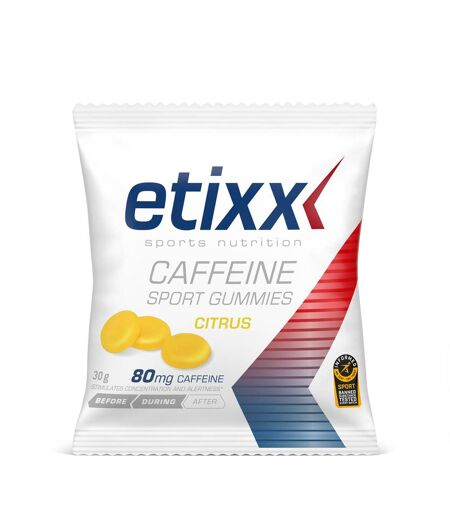 Il est important d'avoir une alimentation variée et équilibrée et un mode de vie sain.Sport Gummies avec de la caféine pour la stimulation de la vigilance et de la concentration pendant les activités physiques.Contient 80 mg de la caféine par sachetAvec 23 g de glucides pour un apport des réserves énergétiques rapideDe délicieux bonbons de sport au goût d’agrumeForme galénique agréableFacile à doserLa caféine est une substance naturelle, un stimulant qu’on retrouve dans des feuilles, graines, haricots et fruits de certaines plantes. Les sources les plus importantes de la caféine dans notre alimentation sont le thé, le café, le chocolat et le coca.La caféine est aussi un supplément qui améliore les performances et sur lequel beaucoup de recherches scientifiques ont été menées. En 2004, la caféine a été supprimée de la liste des produits dopants WADA.La prise de caféine assure un meilleur focus, une meilleure concentration et vigilance, un temps de réaction plus court et un sentiment de fatigue et de douleur diminué. La dose recommandée de la caféine varie de 1-6 mg/kg PC. Cependant, pour la caféine, "le plus sera le mieux" ne s'applique pas. A partir d’une dose de 1-3 mg/kg PC , des effets positifs sont ressentis. L’avantage des doses plus faibles est que l’usage n’entraîne pas les effets secondaires connus de la caféine comme les palpitations, distorsions de la motricité fine, angoisse, tremblements, agitation, nervosité, vertige et l’insomnie.Etixx Caffeine Sport Gummies contiennent de la caféine (80 mg par sachet) qui contribue à augmenter la concentration, le focus et la vigilance. Il assure un booster d’énergie mental ainsi que physique avant et pendant l’entraînement.Les glucides supplémentaires (23g par sachet) dans les Caffeine Sport Gummies contribuent au maintien des réserves de carburant pendant l’effort. Les glucides sont les sources d’énergie les plus importantes pendant les efforts et la quantité des glucides disponibles est un facteur qui détermine les performances. Les réserves de glucides dans le corps sont limités. C’est pourquoi il est important que les glucides soient complétés pendant des efforts de > 60min.Pour qui les Etixx Caffeine Sport Gummies sont-ils utiles?Tous les types d’efforts: efforts d’endurance >60min, efforts à haute intensité de 1-60min, efforts avec intervalle, sports d’équipe, sports stop-and-go, efforts de précision, efforts all-out de courte durée, des efforts où le temps de réaction est importantLes sportifs qui aiment maintenir la concentration pendant/ avant la compétitionLes athlètes qui ont besoin d’un booster d’énergie avant/pendant l’effortComposition:Sirop de blé, sucre, gélatine, eau, acidifiant (acide citrique), colorant naturel (lutéine), arôme naturel (agrumes), caféine, agent d'enrobage (cire de carnauba), selValeur nutritionnelle: Pour 100 gPar sachet (30 g)Energie 333 kcal / 1410 kj100 kcal / 423 kjProtéines 7,3 g2,2 gGraisses <0,1 g0Glucides 75 g23 g dont sucres60 g18 gsel0,04 g0,01... ...