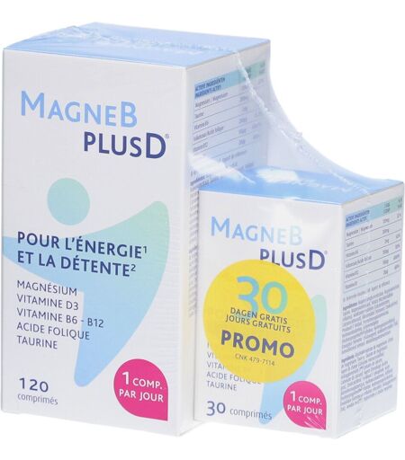 Complément alimentaire à utiliser dans le cadre d’une alimentation variée, équilibrée et d’un mode de vie sain. Complément alimentaire à base de magnésium, taurine, vitamines B6, B12, acide folique et vitamine D3. Il s'agit d'un complément alimentaire destiné à la conservation de l'énergie¹ et à aider à se détendre². Pour soutenir les niveaux d'énergie³ et aider à réduire la fatigue⁴ Pour la concentration, la capacité d'apprentissage et la résistance mentale⁵ Pour le fonctionnement du système immunitaire⁶ Pour la fonction musculaire⁷ MagneBplusD contient du magnésium sous forme organique, de sorte qu'il est bien absorbé et bien toléré par le tractus gastro-intestinal. ¹ L'acide folique, le magnésium et la vitamine B6 contribuent à réduire la fatigue.² Le magnésium contribue à une fonction psychologique normale, à un fonctionnement normal du système nerveux et à une fonction musculaire normale.³ Le magnésium, les vitamines B6 et B12 contribuent à un métabolisme énergétique normal.⁴ Le magnésium, les vitamines B6 et B12 contribuent à réduire la fatigue et l'épuisement.⁵ Le magnésium et les vitamines B6 et B12 contribuent à une fonction psychologique normale, y compris la capacité de concentration, la capacité d'apprentissage et la résistance mentale.⁶ La vitamine D et les vitamines B6 et B12 contribuent au fonctionnement normal du système immunitaire.⁷ Le magnésium et la vitamine D contribuent au maintien d'une fonction musculaire normale. IngrédientsGlycérophosphate de magnésium, Citrate de magnésium, Taurine, Taurate de magnésium, Agent de charge (Cellulose microcrystalline), Antiagglomérants (Phosphates de calcium, Carbonate de calcium), Agent d'enrobage (Acides gras), Cholécalciférol, Pyridoxal 5'-phosphate, Acide ptéroylmonoglutamique, Hydroxocobalamine, Gélifiants (Hydroxypropylméthylcellulose, Hydroxypropylcellulose), Émulsifiant (Gomme de cellulose réticulée), Antiagglomérant (Talc), Amidon modifié, Triglycérides à chaîne moyenne. Données nutritionnelles Ingrédients par comprimé Magnésium 120 mg 32 %Taurine 200 mgVitamine B6 2 mg 143 %Acide folique 200 mcg 100 %Vitamine B12 150 mcg 6000 %Vitamine D3 20 mcg 400 % % AR : Apport de référence Conseils d'utilisation1 comprimé par jour pendant le repas. Précautions d'emploi Conserver dans un endroit frais et sec. Tenir hors de portée des enfants. Ne pas dépasser la dose recommandée. Les enfants, les femmes enceintes et allaitantes, pas d’utilisation sans l’avis de votre pharmacien. Informez-vous avec une prise simultanée de médicaments. Pas d’utilisation prolongée sans l’avis d’un spécialiste. Poids net120 + 30 comprimés FabricantCeres Pharma saKortrijksesteenweg 1091/B9051 GandBelgique ...