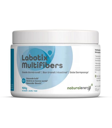 Complément alimentaire à utiliser dans le cadre d’une alimentation variée, équilibrée et d’un mode de vie sain.Natural Energy Labotix Multifibers est un complément alimentaire à base d'extrait de haricots de guar, d'inuline, de concentré de fruits et légumes fermentés, d'extrait de fruit de tamarin, de bêta-glucan et de biotine. Le tamarin soutient le transit intestinal, et la biotine contribue au maintien des muqueuses normales, y compris la muqueuse intestinale.IngrédientsExtrait de Haricots de Guar (Cyamopsis tetragonoloba (L.) Taub.), Inulin, Concentré de fruits et légumes fermentés (Pomme (Malus domestica), Carotte (Daucus carota), Mûrier blanc (Morus alba), Ananas (Ananas comosus), Radis (Raphanus sativus), Citron (Citrus x limon), Orange (Citrus sinensis), Betterave rouge (Beta vulgaris), Prune (Prunus domestica), Prune séchée (Prunus domestica), Fruit de la passion (Passiflora edulis), Pastèque (Citrullus lanatus), Lyciet (Lycium barbarum), Acérola (Malpighia glabra), Asperge (Asparagus officinalis), Banane (Musa x paradisiaca), Myrtille (Vaccinium myrtillus), Cassis (Ribes nigrum), Brocoli (Brassica oleracea), Cerise (Prunus avium), Aronie à fruits noirs (Photinia melanocarpa), Canneberge à gros fruits (Vaccinium macrocarpon), Groseille à maquereau (Ribes uva-crispa), Raisin (Vitis vinifera), Grapefruit (Citrus paradisi), Aubépine à deux styles (Crataegus laevigata), Datte chinoise (Ziziphus jujuba), Litchi (Litchi chinensis), Melon (Cucumis melo), Papaye (Carica papaya), Pêche (Prunus persica), Poire (Pyrus communis), Grenade (Punica granatum), Framboise (Rubus idaeus), Fraise (Fragaria x ananassa), Tomate (Lycopersicon esculentum)), Extrait de fruit de tamarin (Tamarindus indica L.), Antiagglomérant (Dioxyde de Silicium), Bêta-glucane provenant d'AVOINE (Avena sativa L.), Arôme naturel, Arôme, Jus de carotte noire concentré (Daucus carota L.), Colorant (Rouge de betterave), D-biotine.Allergènes : Gluten.Valeurs nutritionnellesÉlémentPar 100 gPar 5,5 g (1 mesure)Énergie (kJ/kcal)1300 kJ / 310 kcal71,5 kJ / 17,1 kcalGlucides30 g1,65 gSucres5 g0,28 gFibres50 g2,75 gProtéines2 g0,11 gSel1 g0,055 gConseils d'utilisationPrendre 1 mesure (5,5 g) par jour, à dissoudre dans 200 ml d'eau. Ne pas dépasser la dose recommandée.Précautions d'emploiConserver au frais, au sec et à l'abri de la lumière. Veuillez tenir compte, le cas échéant, des autres indications de stockage figurant sur l'emballage. La quantité journalière recommandée indiquée ne doit pas être dépassée.Poids net100 g de poudreAdresse du FabricantCeres Pharma Kortrijksesteenweg 1091/B 9051 Gand Belgique ...