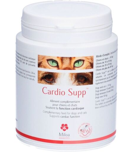 Complément alimentaire pour chiens et chats.IndicationConserver dans un endroit frais et sec. Tenir hors de portée des enfants. Ne pas dépasser la dose recommandée. Tenir à l’abri du soleil. Bien refermer après ouverture. À utiliser dans les 24 mois après la date de fabrication.Recommandations nutritionnelles Chiens et chats < 10 kg 1/2 cp/j Chiens de 10 à 20 kg 1 cp/j Chiens de 20 à 30 kg 2 cp/j Chiens > 30 kg 3 cp/j La quantité mentionnée ci-dessus peut être doublée les 2 premières semaines. La durée de supplémentation d’Anti-Ageing TM Miloa peut varier en fonction des besoins de votre animal. Les comprimés sont très appétents et acceptés spontanément par la majorité des chiens et des chats. Ils peuvent également être émiettés et mélangés à la nourriture.CompositionFarine de poisson, Huile de poisson riche en EPA/DHA, Olea europaea (olivier) 10 %, Styphnolobium japonicum (sophora japonica) 5%, Punica granatum (grenade) 3%, Camellia sinensis (thé vert), riche en polyphénols, Levure inactivée riche en coenzyme Q10.Additifs par kiloFarine de poisson, Huile de poisson riche en EPA/DHA, Olea europaea (olivier) 10 %, Styphnolobium japonicum (sophora japonica) 5%, Punica granatum (grenade) 3%, Camellia sinensis (thé vert), riche en polyphénols, Levure inactivée riche en coenzyme Q10. ...